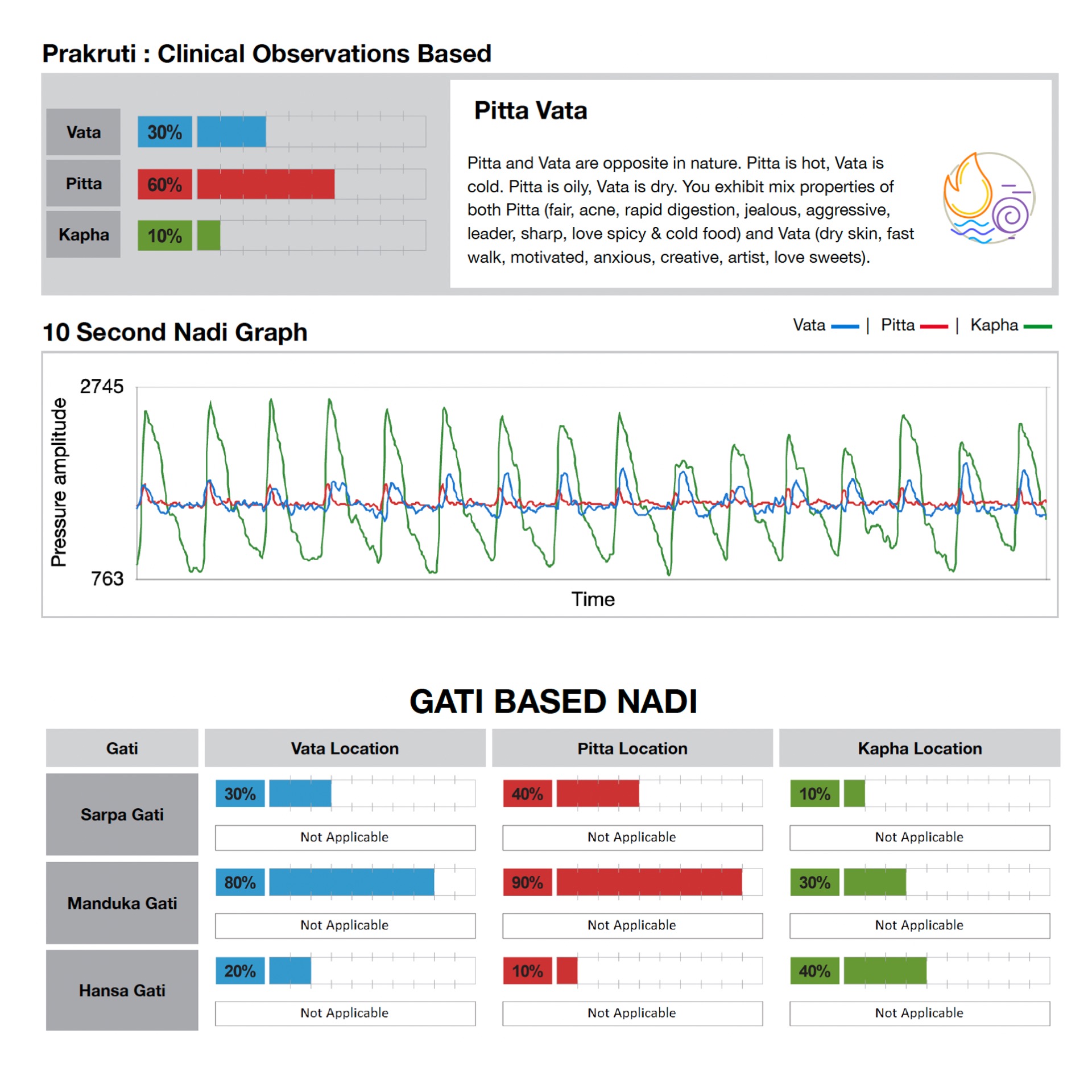 High-precision sensors record signals at Vata, Pitta & Kapha points.